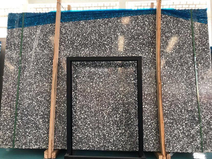 人造無機水磨石,生產(chǎn)主要原材料,天然礦石沙,高標號白水泥和水,經(jīng)過先進制作工藝流程壓制成型荒料,再根據(jù)工程設(shè)計厚薄規(guī)格切割成大板。