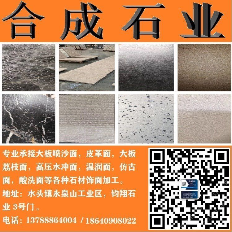 專業(yè)承接皮革面、溫潤面、噴沙面,鋼砂面、高壓水沖面,大板荔枝面,絲綢面,溫潤面,磨砂面,布紋面,斧鑿面(龍眼面),仿古面等各種飾面加面