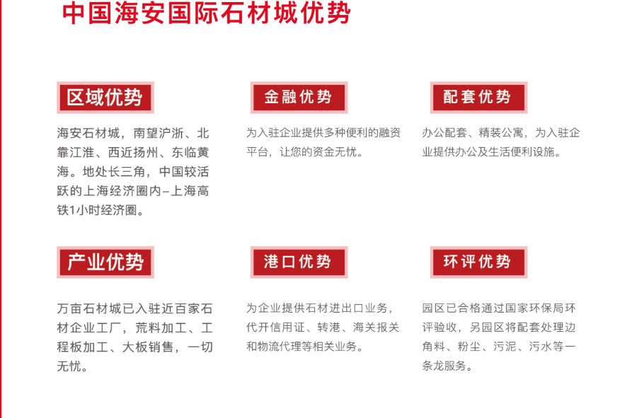 項目得到當(dāng)?shù)卣拇罅χС郑度牖A(chǔ)設(shè)施20億元,主干道雙向六車道已全面通車,綠化、官網(wǎng)、路燈、水電等七通一平已全部到位,達到一級城市主干道水平。石材城總占地面積15000畝,一期占地面積3000畝,規(guī)劃總建筑面積約138萬平方米,于2013年1月18日全面開工建設(shè),目前已有80多家企業(yè)正式投產(chǎn)。