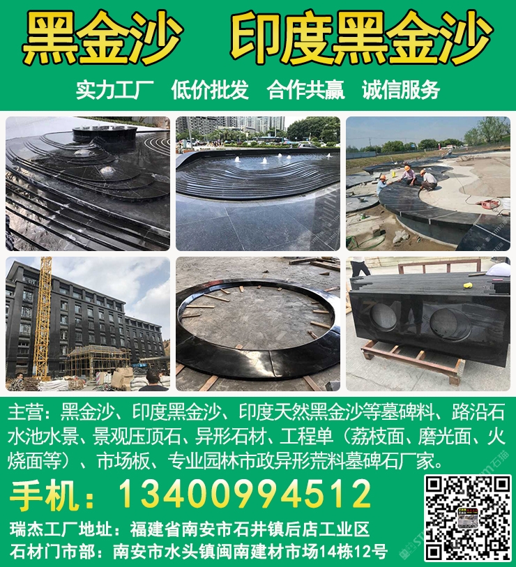 發(fā)布信息: 瑞杰黑金沙林總13400994512專業(yè)印度黑金沙供應(yīng)商,實力石材工廠主要加工:黑金沙、黑金砂、印度黑金沙、印度天然黑金沙、印度黑色石材、印度黑石、黑金沙石材、黑金沙花崗巖、新礦黑金砂、國產(chǎn)黑金沙、新黑金沙石材等墓碑料、路沿石、水池水景、景觀壓頂石、異形石材、工程單(荔枝面、磨光面、火燒面等)、市場板、專業(yè)園林市政異形荒料墓碑石廠家,實力工廠、低價批發(fā)、合作共贏、誠信服務(wù). 工廠地址:福建省南安市石井鎮(zhèn)后店工業(yè)區(qū),門市部:南安市水頭鎮(zhèn)閩南建材市場