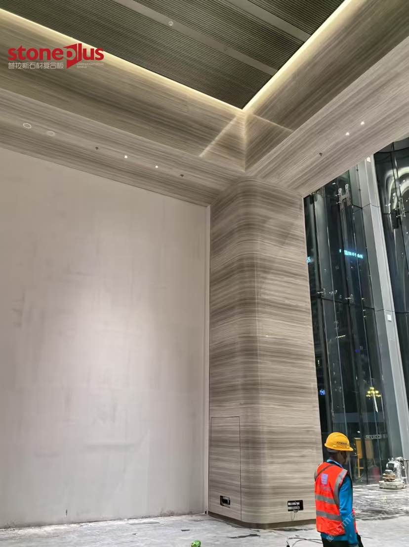 發(fā)布信息: 澳門中心位于廣州市黃埔區(qū)魚珠片區(qū),項目定位為商業(yè)商務綜合體打造以港澳特色為主的、有國際影響力的科技金融和數(shù)字經(jīng)濟總部基地,并大力引入澳門文化和商業(yè)業(yè)態(tài),打造充滿澳門風情的文創(chuàng)藝術街區(qū),實現(xiàn)科技金融產(chǎn)業(yè)一體化、粵澳葡三地合作一體化。 其中大樓室內(nèi)墻面采用白木紋復合鋁蜂窩,預埋螺栓打孔后再進行復合,到現(xiàn)場進行干掛安裝;包柱采用白木紋復合鋁蜂窩平板拼弧工藝,對手加工工藝要求較高,我們普拉斯加工對品質(zhì)的追求與現(xiàn)場的安裝效果相得益彰。