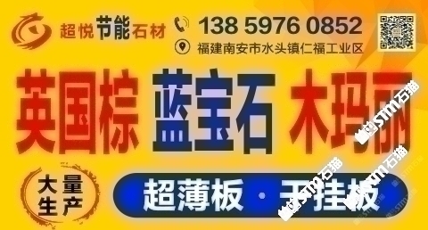 發(fā)布信息: 木瑪麗/藍(lán)寶石/英國(guó)棕(超薄板)吳總 13859760852手機(jī)微信同號(hào)-福建超悅石材薄板科技有限公司是一家專注于生產(chǎn)、研發(fā)花崗巖超薄板的研發(fā)型企業(yè),秉承“用創(chuàng)新的芯、做超薄的板、走節(jié)能的路”的發(fā)展理念,在多年來(lái)堅(jiān)持不懈的努力下,成功地研發(fā)了擁有環(huán)保性能及高新技術(shù)的超薄板,其優(yōu)點(diǎn)可與國(guó)際薄板加工技術(shù)媲美。 花崗巖超薄板被廣泛應(yīng)用于復(fù)合板領(lǐng)域,包括保溫材料和鋁蜂窩等,是建筑外墻裝飾材料的。該產(chǎn)品降低了建筑成本、節(jié)約了裝飾 材料,縮短了施工周期,是當(dāng)今社會(huì)廣為提倡和國(guó)家大力推廣的綠色、環(huán)保、節(jié)能建筑裝飾材料。 公司堅(jiān)持奉行“創(chuàng)新永不止步,品質(zhì)始終如一”的經(jīng)營(yíng)理念,爭(zhēng)創(chuàng)花崗巖超薄板領(lǐng)導(dǎo)品牌,將花崗巖超薄板做專做精做廣做強(qiáng)。