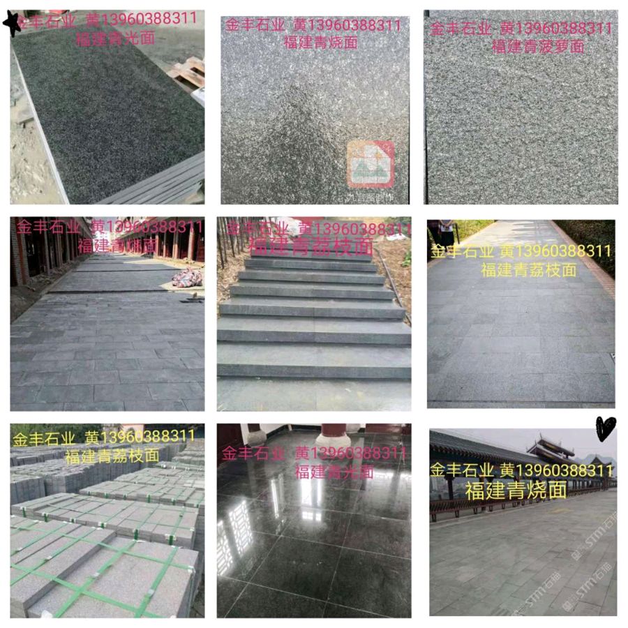 發(fā)布信息: 《金豐石業(yè)》大量現(xiàn)貨青石荔枝面3公分65元/㎡ 出售:福鼎黑 福建青 墨綠青 橄欖綠 橄欖青 萬源青 達州青 浪淘沙 福壽紅 荒料 自有礦山 主營:雕刻 欄桿 光面 荔枝面 燒面 磨菇面 自然面 小方塊 路沿石 承接:各種花崗巖大理石工程單 地址:水頭鎮(zhèn)下店村公路邊 聯(lián)系人黃先生13960388311