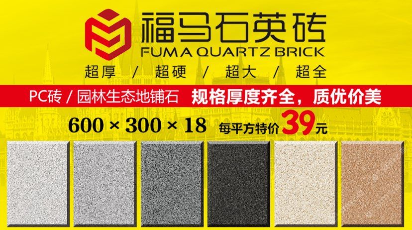 發(fā)布信息: ??福馬石英磚 ? 生態(tài)地鋪石創(chuàng)意源自于天然石材,品質(zhì)勝于天然石材。 以天然石粉、高嶺土、石英砂、長(zhǎng)石等原料,經(jīng)研磨、混合制漿、干燥噴粉、壓制、多層施釉、燒結(jié),1250℃高溫使原材料產(chǎn)生熔融狀態(tài),冷卻后重組結(jié)晶。這使得生態(tài)石更加密實(shí)和堅(jiān)硬。 ? 1、全瓷化通體材質(zhì),高瓷化度,低吸水率,使產(chǎn)品防滑、耐磨、高抗折、高耐污,清潔方便性。 ? 2、依據(jù)天然石材的表面,開具特殊模具表面,使生態(tài)地鋪石具有石材質(zhì)感,仿真度更高,更防滑,不同于普通廣場(chǎng)磚 ? 3、產(chǎn)品表面經(jīng)7道以上特殊釉水工藝處理,使產(chǎn)品具有耐磨、防滑,高耐污,清潔方便的特點(diǎn)。 ? 4、產(chǎn)品顏色豐富(量大可定制),尺寸多樣。能夠配合設(shè)計(jì)師獨(dú)特創(chuàng)意,實(shí)現(xiàn)不同環(huán)境和個(gè)性所要求的裝飾風(fēng)格。 ? 5、耐久性好,適合場(chǎng)所廣。產(chǎn)品具有耐磨抗壓、防滑耐污、耐酸堿、抗凍、不褪色的特點(diǎn)??捎糜诖笮拓涇嚳赏ㄐ械?,市政工程,小區(qū)景觀路面,休閑廣場(chǎng),園林綠化,公園公共停車場(chǎng)等。 ? 6、后期養(yǎng)護(hù)、修補(bǔ)簡(jiǎn)單。產(chǎn)品顏色可控,不同批次產(chǎn)品色差控制在95%左右,且常規(guī)顏色產(chǎn)品,長(zhǎng)期備有庫(kù)存。