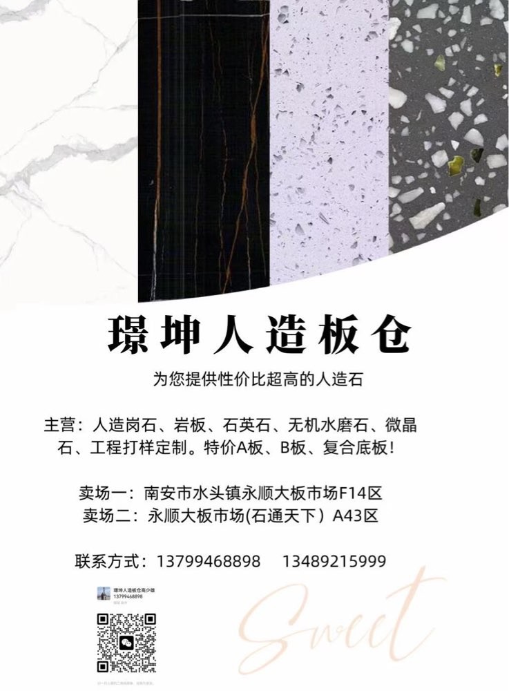 發(fā)布信息: 一璟坤人造板倉一 主營(yíng):人造崗石,石英石,巖板,無機(jī)水磨石, 微晶石,工程打樣定制,特價(jià)A板,B板,復(fù)合底板 賣場(chǎng)地址:福建省南安市水頭鎮(zhèn)永順大板市場(chǎng)A43區(qū),F(xiàn)10一F14區(qū)。財(cái)富熱線:13799468898高先生