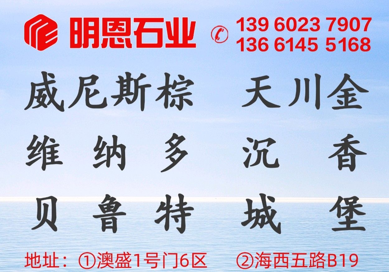 明恩石業(yè)(水頭)有限公司 聯(lián)系人:鄭先生    139****7907 查看 139****7907 查看 主營(yíng)范圍: 大板批發(fā)、荒料、礦山、石材外貿(mào)、大理石加工、 企業(yè)地址:福建南安中國(guó)福建南安水頭鎮(zhèn)澳盛大板市場(chǎng)1號(hào)路6B棟6區(qū),明恩石業(yè)
